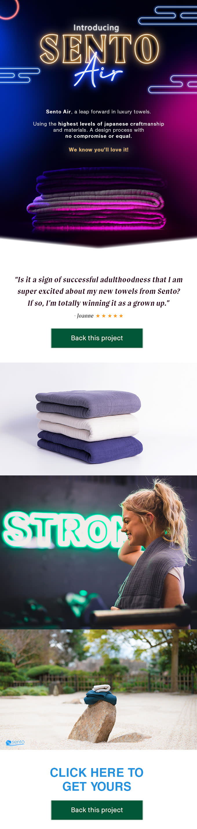 Hello again, backers! Today we have some more good news: our 4th Kickstarter is now LIVE, and it’s our best one yet! Introducing our next big redesign of your beloved bath towel: The Sento Air.